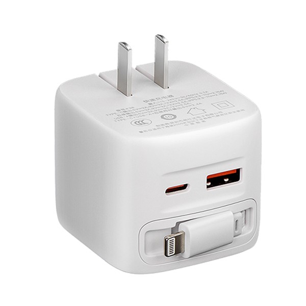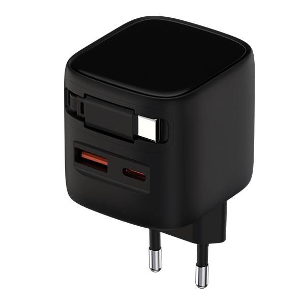 30W dual-port charger with 3.9ft retractable USB-C cable (one-click retraction). USB-A supports QC3.0 (18W), USB-C delivers PD3.0 30W fast charging.