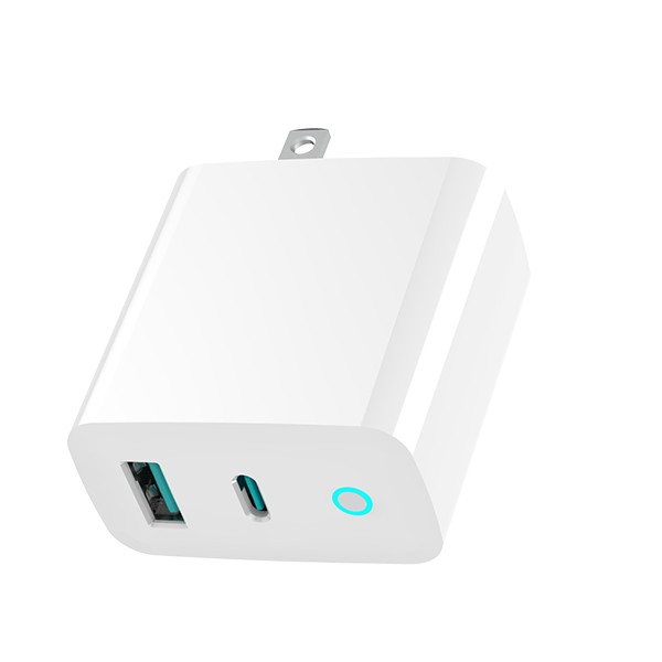 65W high-power dual-port fast charger with LED indicator for real-time charging status. Features USB-A + USB-C ports with intelligent power allocation: single-port up to 65W (PD3.0/QC4+), dual-port 45W+18W simultaneously. Compatible with laptops, phones, tablets, etc. Built with GaN technology for compact size and safety protections (OVP/OCP/OT