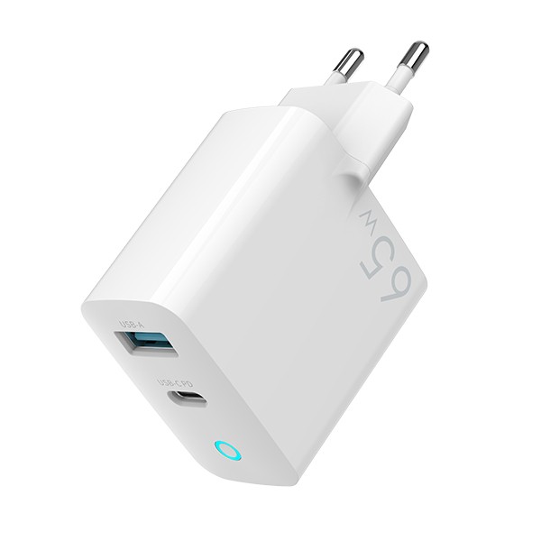 65W dual-port USB-A & USB-C GaN Charger with PD/QC fast charging. Intelligent power distribution,