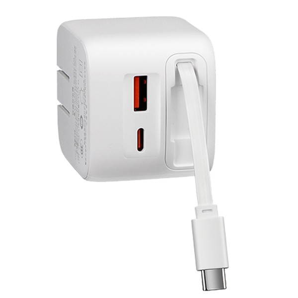30W dual-port charger with 3.9ft retractable USB-C cable (one-click retraction). USB-A supports QC3.0 (18W), USB-C delivers PD3.0 30W fast charging.